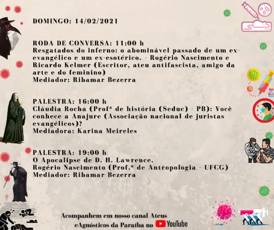 Segue a programação online do Encontro de Ateus e Agnósticos de Paraíba deste domingo, último dia do evento.